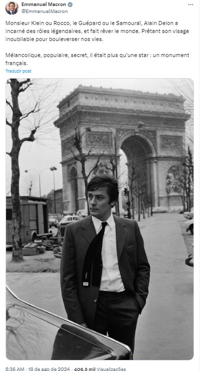 “Monsieur Klein ou Rocco, o Guepardo ou o Samurai, Alain Delon desempenhou papéis lendários e fez o mundo sonhar. Emprestando seu rosto inesquecível para virar nossas vidas de cabeça para baixo. Melancólico, popular, secreto, ele era mais que uma estrela: um monumento francês”.