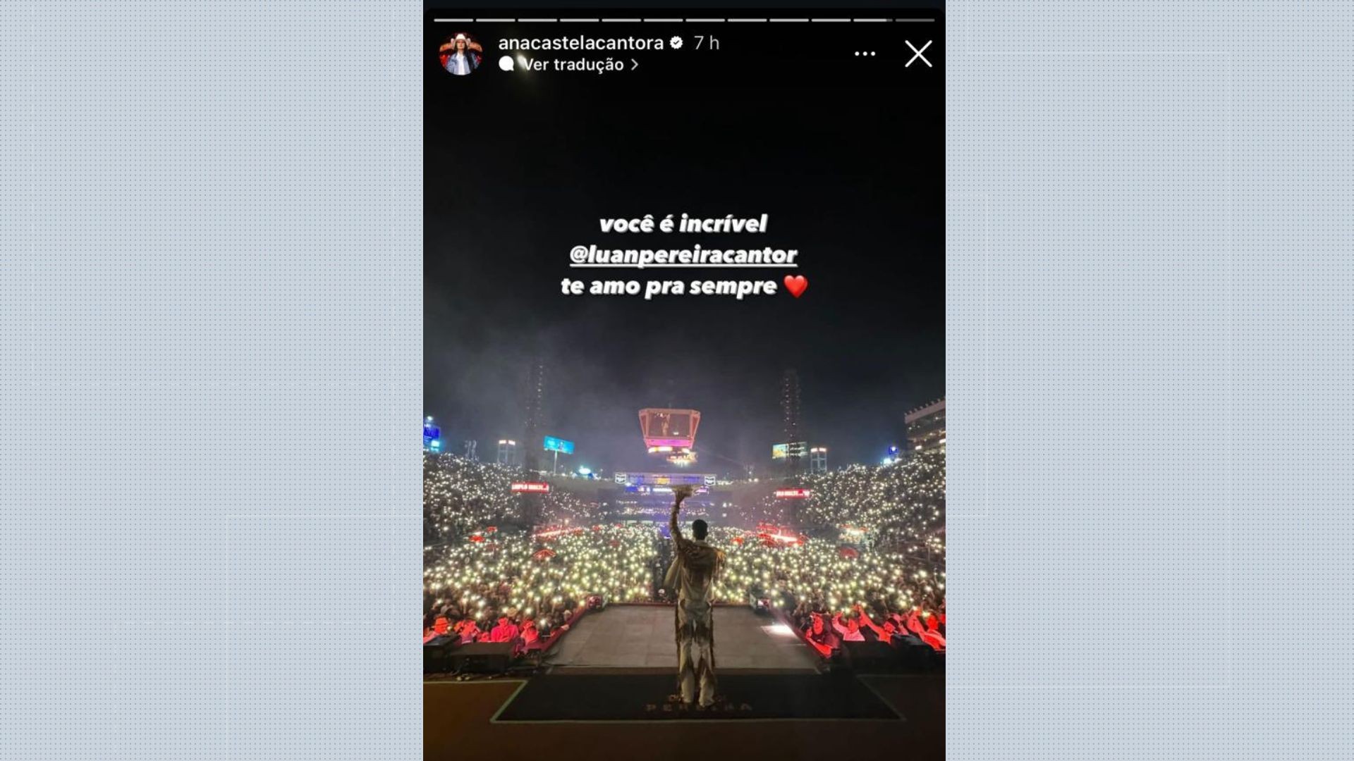 A boiadeira postou uma foto de Luan no palco, com a legenda: “Você é incrível. Te amo pra sempre”.