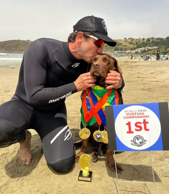 Não foram só os atletas Gabriel Medina e Tatiana Weston-Webb que garantiram pódios para o Brasil no surfe neste mês. O país também levou a melhor no Campeonato Mundial de Surf Dog, que ocorreu no último domingo (04), na Califórnia, Estados Unidos. Cacau, uma labradora de 4 anos, competiu ao lado de seu tutor, o surfista Ivan Moreira, garantindo três medalhas de ouro e uma de bronze.