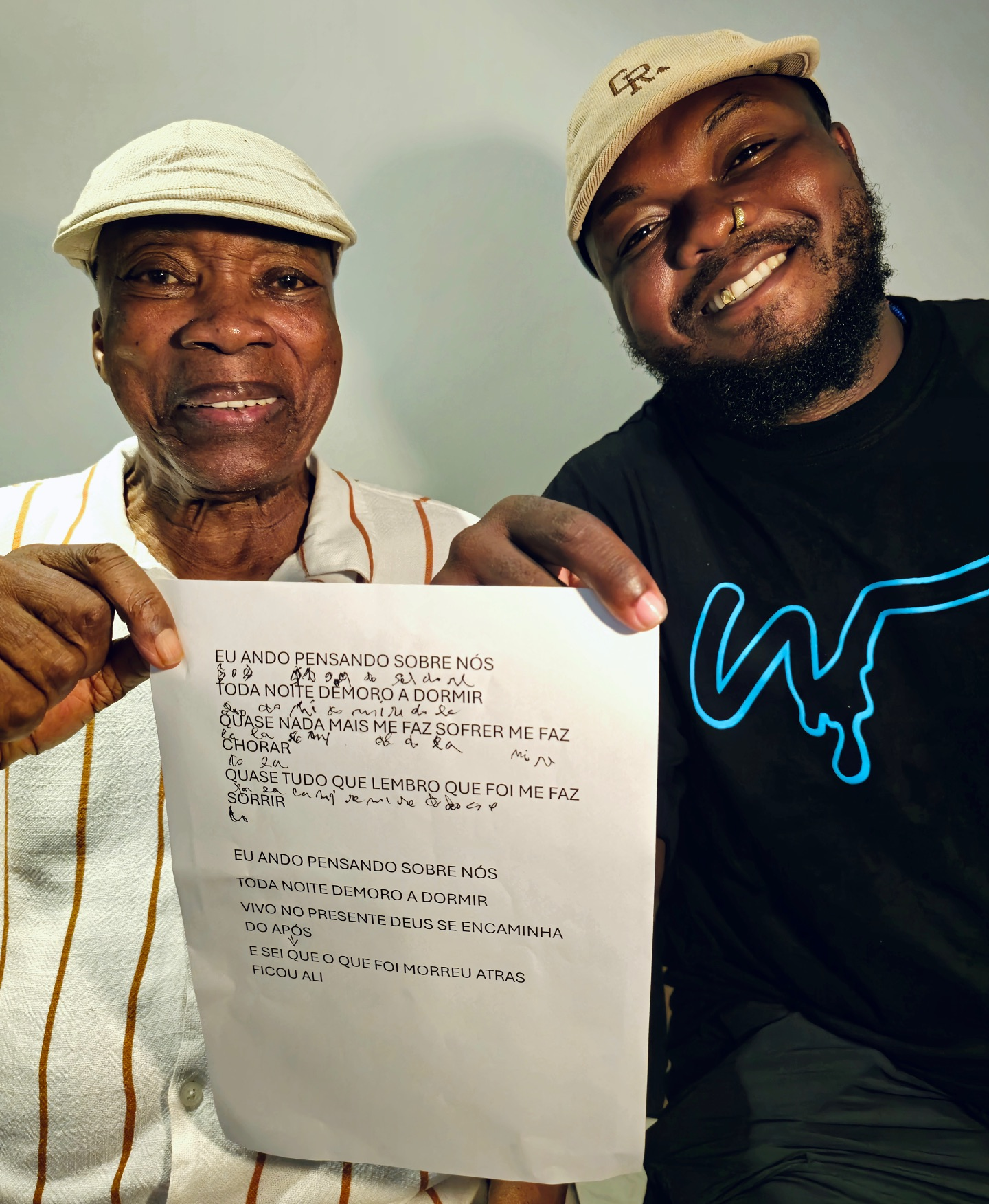 Milton Nascimento (à esquerda) e Djonga posam com a letra do refrão cantado por Milton em rap do oitavo álbum do artista mineiro de hip hop