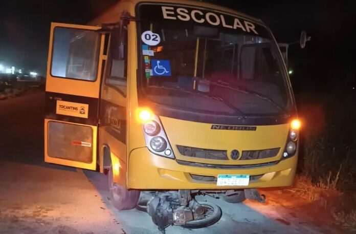 Acidente aconteceu num trecho da rodovia TO-255. Segundo a Polícia Militar, os motoristas envolvidos no acidente foram ouvidos e liberados. Homem morreu após moto ser arrastada por ônibus escolar