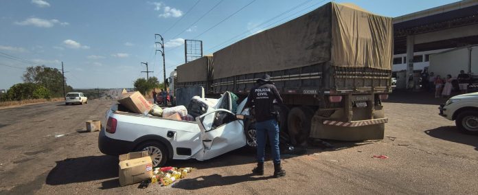 Com o impacto da batida, a picape, que estava carregada de produtos alimentícios, acabou batendo em um caminhão que estava parado na frente do posto de combustível.