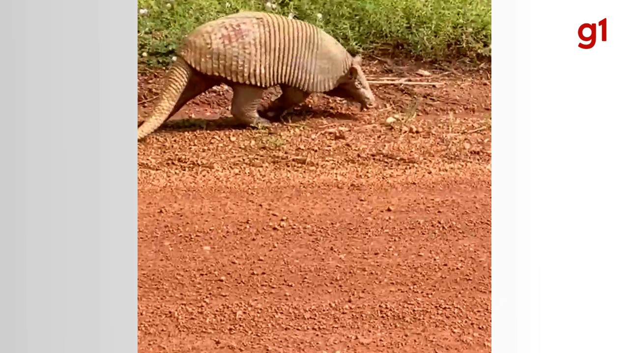 Tatu-canastra pode pesar mais de 20 quilos e medir 1,5 metro com a cauda. Espécie está em extinção devido à caça e às queimadas. Tatu gigante é visto atravessando estrada em Lagoa da Confusão
