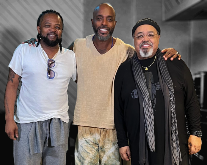 Artista lança o segundo disco em maio com músicas autorais como ‘Encontro de dois sóis’ e ‘Presente’, além de ‘Ogumtech’, single que junta os três cantores. Thiago Thomé (ao centro) entre Xande de Pilares (à esquerda) e Jorge Aragão na gravação da música ‘Ogumtech’