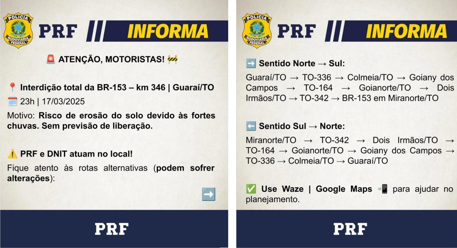 A orientação é que os motoristas continuem seguindo pelas rotas alternativas. Isso porque a previsão de chuvas na região pode fazer com que ocorra nova interdição total da via, segundo a PRF.