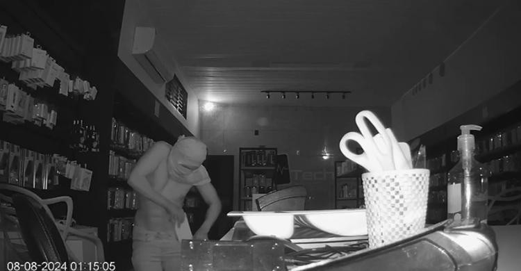 Conforme as imagens, o homem conseguiu desencaixar o forro do para acessar o interior da loja. Usando uma camiseta amarrada na cabeça para esconder a identidade, ele vasculha os produtos e a gaveta do caixa por volta da 1h15. (Assista acima)
