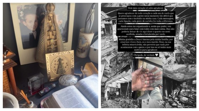“Gente, a casa inteira queimou. Mas o cantinho da minha fé não queimou. Tá aqui, ó: olha minha Bíblia. A minha Nossa Senhora, aqui, ó, o Templo de Salomão. Tudo queimado, mas [aqui] não queimou. Mas Deus é bom demais, acreditem nele. Era pra gente estar morto, eu e minha esposa, Claudia. A prova tá aqui”, disse Rogério em lágrimas (veja vídeo acima).
